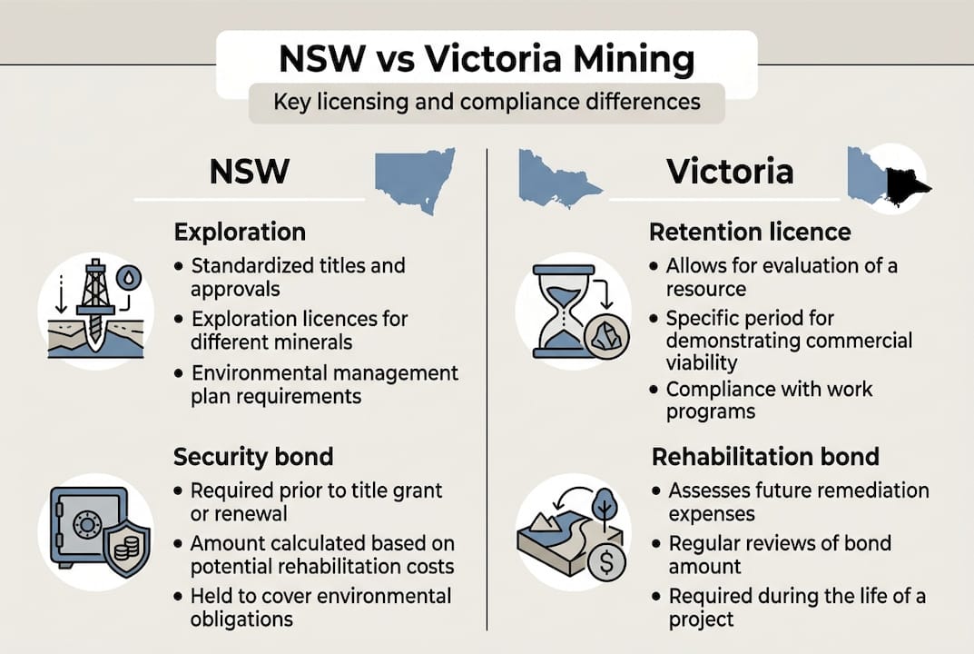 "Australian mining laws are state-based; NSW governed by Mining Act 1992, Victoria by Mineral Resources (Sustainable Development) Act 1990. Exploration requires specific licences for compliance."
