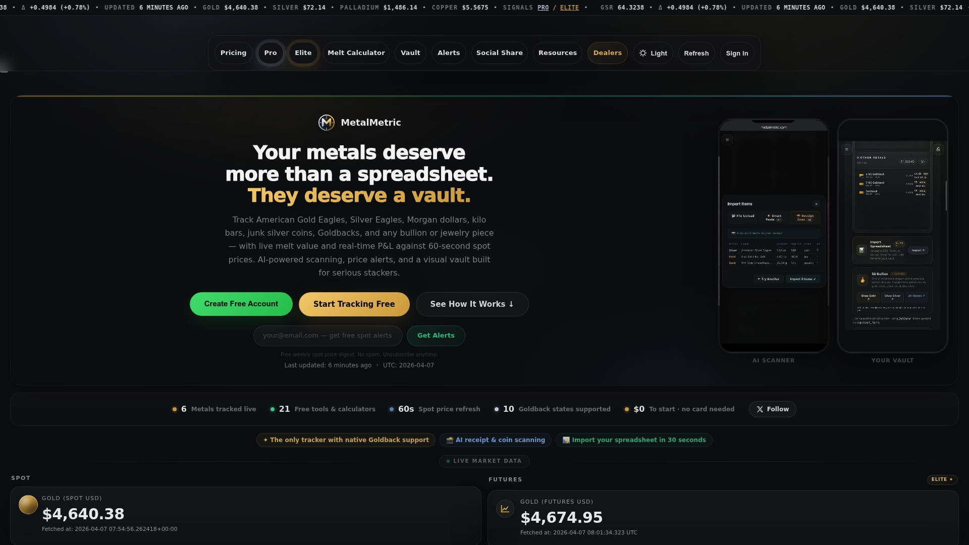 | MetalMetric | Real-time melt values, AI-powered scanning, visual vaults | Multi-metal tracking, AI receipt scanning, strong data privacy | Features gated behind paid tiers | Free Tier, Pro $9/month, Elite $19/month |