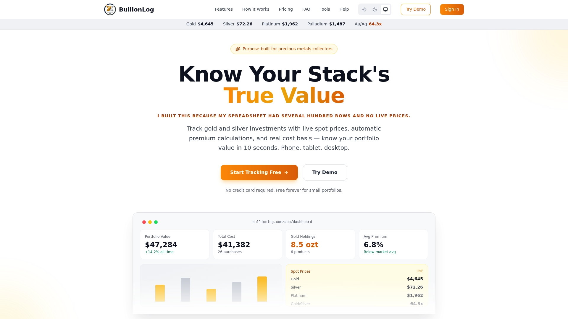 BullionLog is a focused precious metals tracker built for collectors and serious investors. It gives fast access to real-time spot prices and automates premium and cost basis math so you see portfolio performance without manual spreadsheets.