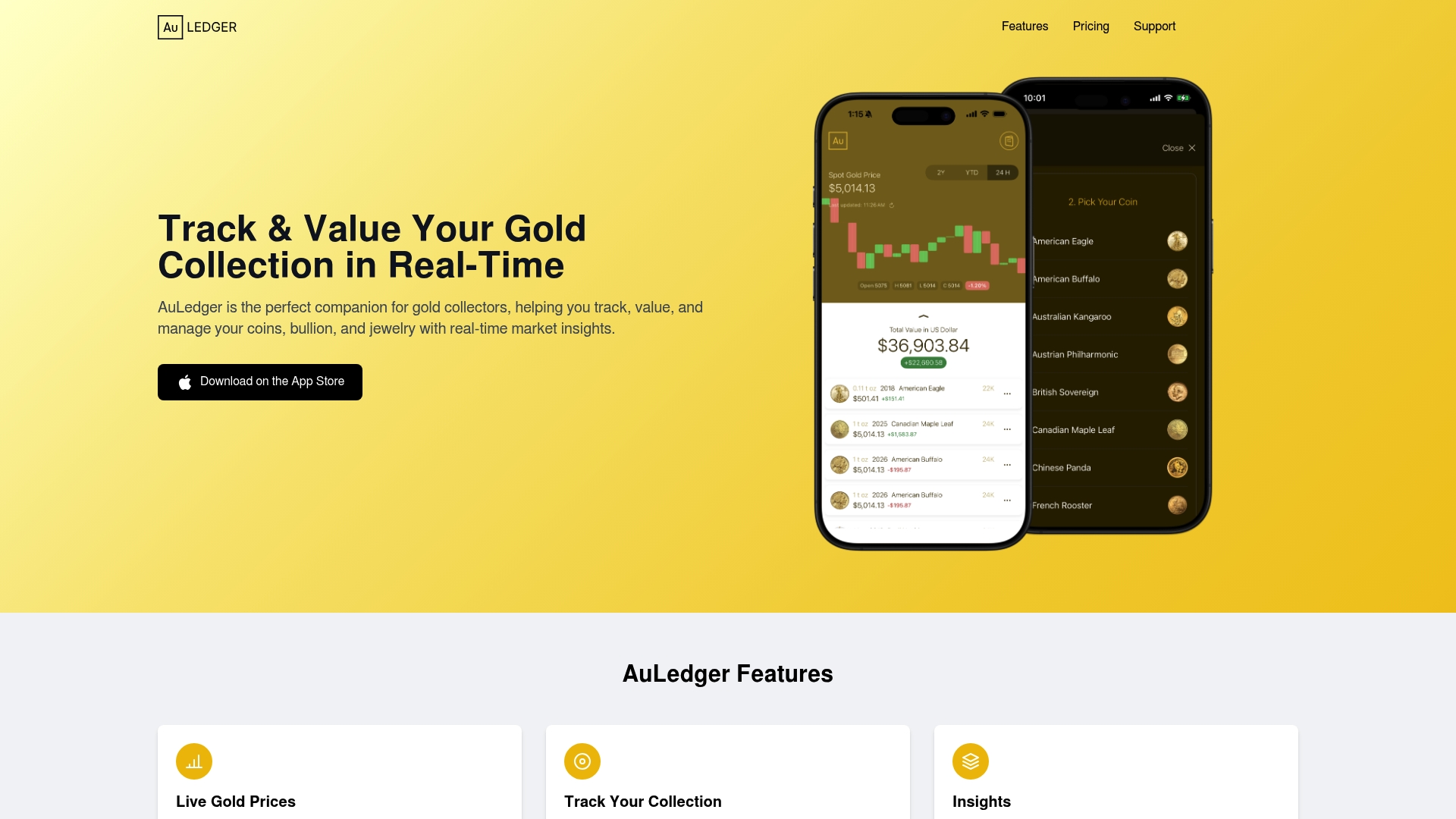 AuLedger offers Live Gold Prices with real time updates, a Track Your Collection system for coins, bars, and jewelry, and Portfolio Valuation that shows total worth, profit, and investment returns.