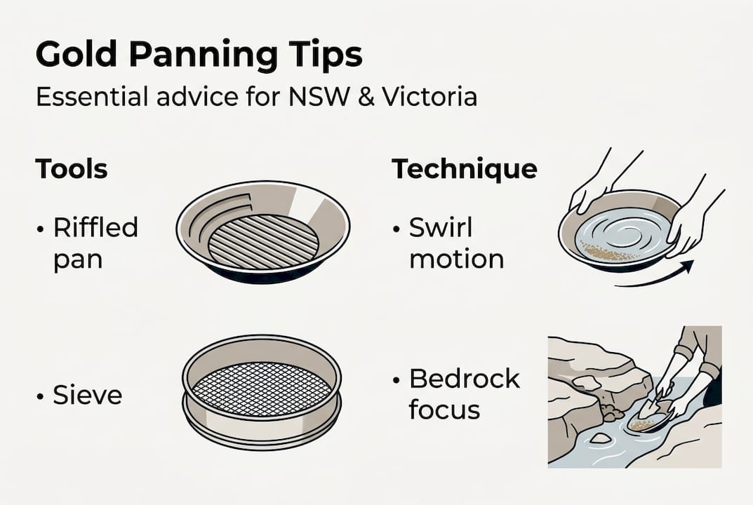 You spend three hours crouched over a creek in central Victoria, washing pan after pan, and walk away with barely a flicker of color. Sound familiar? Most hobbyist panners in New South Wales and Victoria hit this wall not because gold isn't there, but because small technique gaps and missed preparation steps quietly kill their yield. This guide covers everything you need: the right gear, current legal requirements, proven spot-selection strategies, a step-by-step panning method, and advanced efficiency tips that experienced panners use to consistently pull more gold from the same water everyone else walks past.